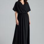 Spódnica midi w kwiaty marszczona w pasie, zapinana na boczny kryty zamek. Kopertowy przód spódnicy. Z przodu pasek z ozdobną metalową klamrą w kolorze złotym. Sukienka bez podszewki i bez kieszeni.