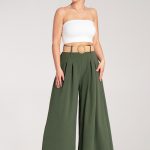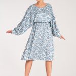 Plisowana spódnica midi, ozdobiona wzorem w białe grochy. Model z wysokim stanem, subtelnymi marszczeniami i stylowym paskiem z klamrą, podkreślającym talię.