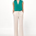 Dopasowane spodnie damskie o kroju fit, które podkreślają sylwetkę, zapewniając jednocześnie komfort noszenia. Wykonane z materiału o lnianej fakturze mieszanki rayonu z dodatkiem lnu, łączą w sobie lekkość, przewiewność i elegancki wygląd. Model z wysokim stanem pięknie zaznacza talię, a nogawka typu bootcut subtelnie poszerza się ku dołowi, optycznie wydłużając nogi. Spodnie zapinane są na suwak i guzik kryty plisą, co podkreśla ich minimalistyczny charakter. Z przodu znajdują się klasyczne kieszenie, z tyłu, dyskretne imitacje kieszeni. Całość uzupełniają szlufki, które pozwalają na stylizację z paskiem. To idealna baza do biurowych zestawów, jak i codziennych, letnich looków.