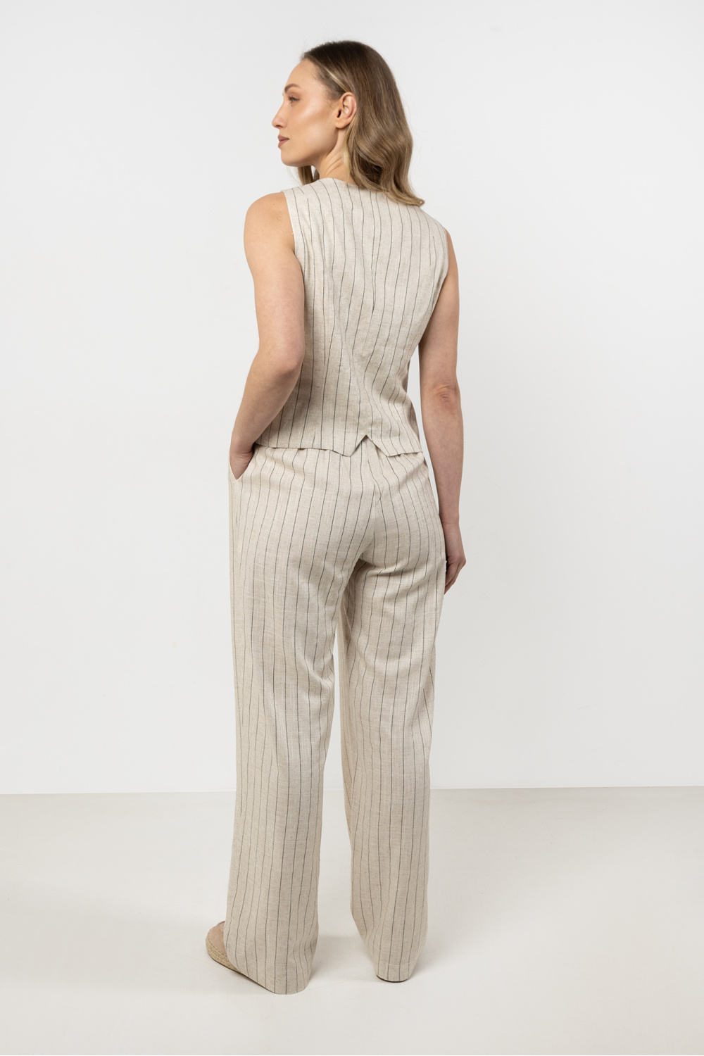 Spodnie lniane z szerokimi nogawkami w delikatne prążki Te spodnie to idealne połączenie elegancji i codziennego komfortu. Wykonane z lnu, zapewniają przewiewność i doskonale układają się na sylwetce. Szerokie nogawki dodają swobody, a elastyczna gumka w talii gwarantuje idealne dopasowanie. Klasyczny wzór cienkich pasków sprawia, że pasują do wielu stylizacji. Połącz lniane spodnie z kamizelką lub marynarką z tej samej tkaniny, a stworzysz elegancki letni look.