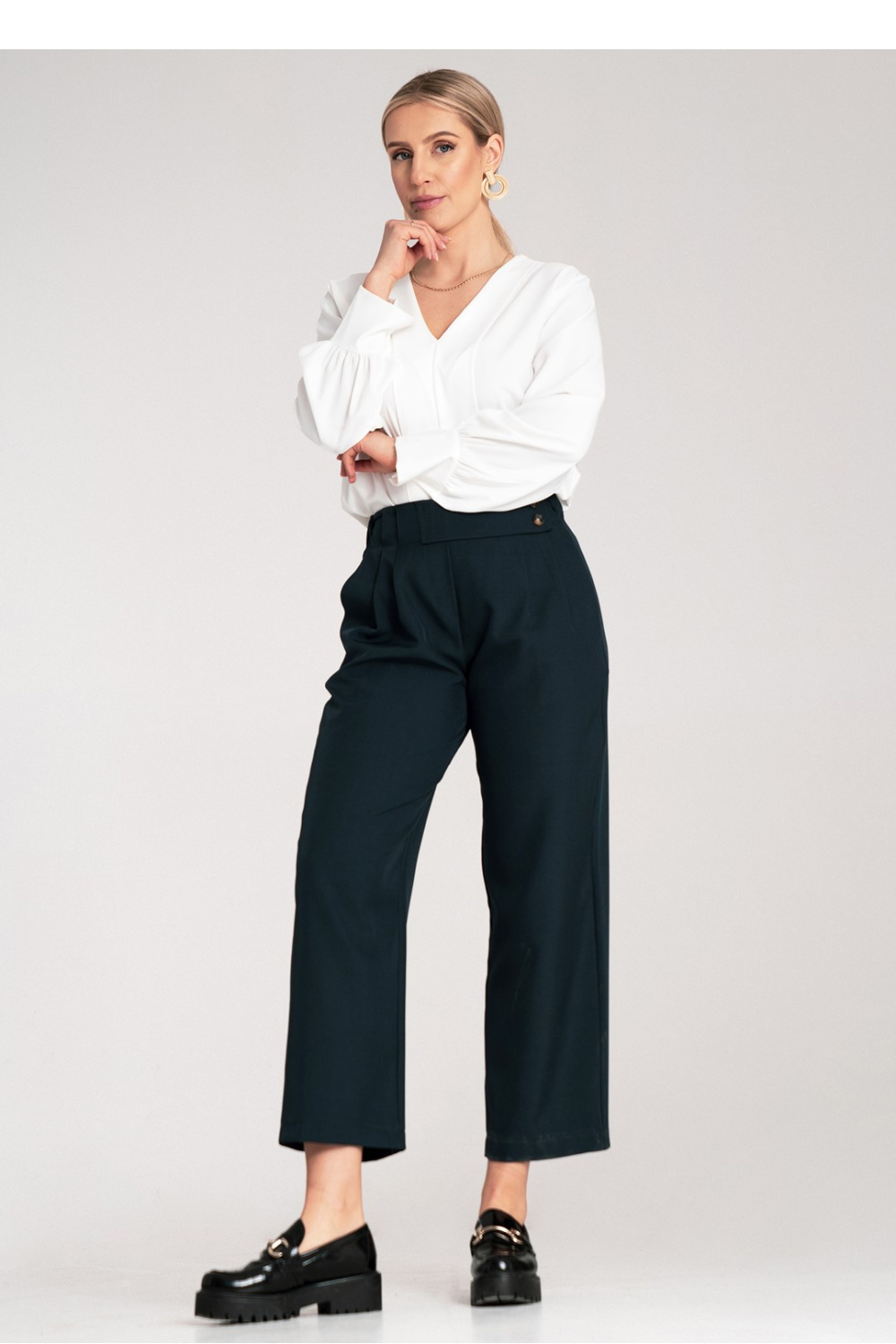 Eleganckie proste spodnie 7/8. Spodnie z wysokim stanem i ozdobnym panelem zapinanym na dwa guziki. Z przodu delikatne zakładki. Spodnie posiadają kieszenie wsuwane.