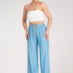 Szerokie spodnie z wysokim stanem i dekoracyjnym, plecionym paskiem. Lekki materiał i luźny krój zapewniają komfort, a subtelne plisy dodają elegancji.