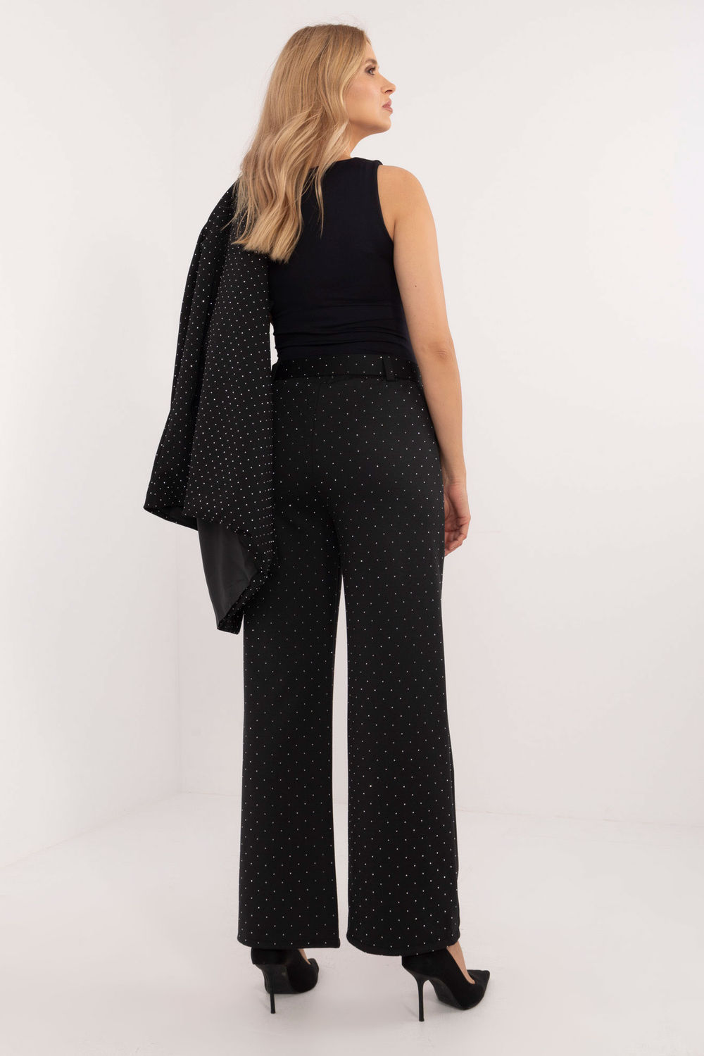 Damskie spodnie materiałowe z błyszczącymi dżetami w formie kropek, które doskonale łączą elegancję z nowoczesnym stylem, idealne na imprezy oraz wizytowe okazje. Wykonane z dominującej wiskozy, spodnie są lekkie i przewiewne, co zapewnia komfort noszenia przez cały dzień. Dzięki wysokiemu stanowi, podkreślają talię i nadają sylwetce elegancki wygląd. Szerokie nogawki dodają im swobody, tworząc modny i luźny fason. Spodnie nie posiadają zapięcia, co sprawia, że są łatwe do zakładania, a kieszenie boczne oferują praktyczność w codziennym użytkowaniu. Dodatkowo, zapinany pasek pozwala na idealne dopasowanie do sylwetki, co czyni te spodnie doskonałym wyborem dla kobiet pragnących wyglądać stylowo na każdej imprezie.