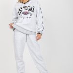Komplet dresowy damski składający się z bluzy oraz spodni. Krótka bluza z długim rękawem oraz kapturem. Długie spodnie z wiązaniem w pasie oraz kieszeniami wsuwanymi.