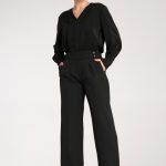 Elegancki komplet damski. Klasyczna marynarka zapinana na jeden guzik i dopasowane spodnie z wysokim stanem oraz kieszeniami.