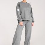 Komplet dresowy w kolorze Grey. Luźna bluza z długimi, szerszymi rękawami i okrągłym dekoltem oraz szerokie spodnie z gumką w pasie i troczkiem.