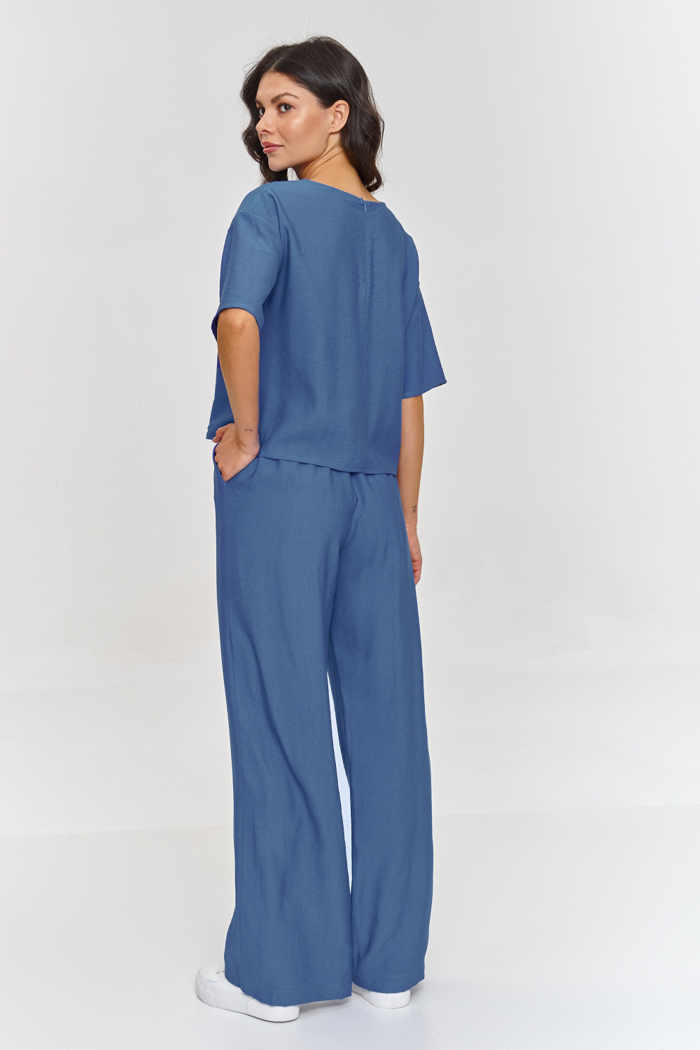 Ten elegancki komplet to idealna propozycja na wiosenne i letnie dni, kiedy chcesz połączyć modny wygląd z wysoką jakością wykonania. Zestaw posiada luźną bluzkę o pudełkowym kroju, który idealnie pasuje do eleganckich stylizacji. Krótki rękaw i prosty fason bluzki sprawiają, że jest to doskonała opcja na formalne i mniej formalne wyjścia, łącząc elegancję z wygodą. Spodnie wyróżniają się szerokimi nogawkami, które nadają stylizacji nowoczesny i elegancki wygląd. Elastyczny pas zapewnia komfort noszenia, a ich długość dodaje całości klasy i stylu. Model wykonany z delikatnego i lekkiego materiału imitującego len. Prosty, ale wysublimowany krój sprawia, że komplet ma ponadczasowy charakter, który będzie wyglądać stylowo na każdej sylwetce. Zestaw doskonale sprawdzi się na spotkania biznesowe, eleganckie wyjścia czy wypady do miasta, kiedy zależy Ci na połączeniu elegancji i swobody. Możesz go zestawić ze szpilkami, eleganckimi sandałami lub białymi sneakersami.