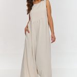 Ten elegancki komplet to idealna propozycja na wiosenne i letnie dni, kiedy chcesz połączyć modny wygląd z wysoką jakością wykonania. Zestaw posiada luźną bluzkę o pudełkowym kroju, który idealnie pasuje do eleganckich stylizacji. Krótki rękaw i prosty fason bluzki sprawiają, że jest to doskonała opcja na formalne i mniej formalne wyjścia, łącząc elegancję z wygodą. Spodnie wyróżniają się szerokimi nogawkami, które nadają stylizacji nowoczesny i elegancki wygląd. Elastyczny pas zapewnia komfort noszenia, a ich długość dodaje całości klasy i stylu. Model wykonany z delikatnego i lekkiego materiału imitującego len. Prosty, ale wysublimowany krój sprawia, że komplet ma ponadczasowy charakter, który będzie wyglądać stylowo na każdej sylwetce. Zestaw doskonale sprawdzi się na spotkania biznesowe, eleganckie wyjścia czy wypady do miasta, kiedy zależy Ci na połączeniu elegancji i swobody. Możesz go zestawić ze szpilkami, eleganckimi sandałami lub białymi sneakersami.