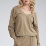 Komplet dwuczęściowy składający się z bluzki oraz krótkich spodenek. Bluzka ozdobiona z przodu wstawkami z dzianiny. Bluzka z rękawem 3/4 oraz okrągłym dekoltem. Krótkie spodenki z ażurowymi wstawkami.