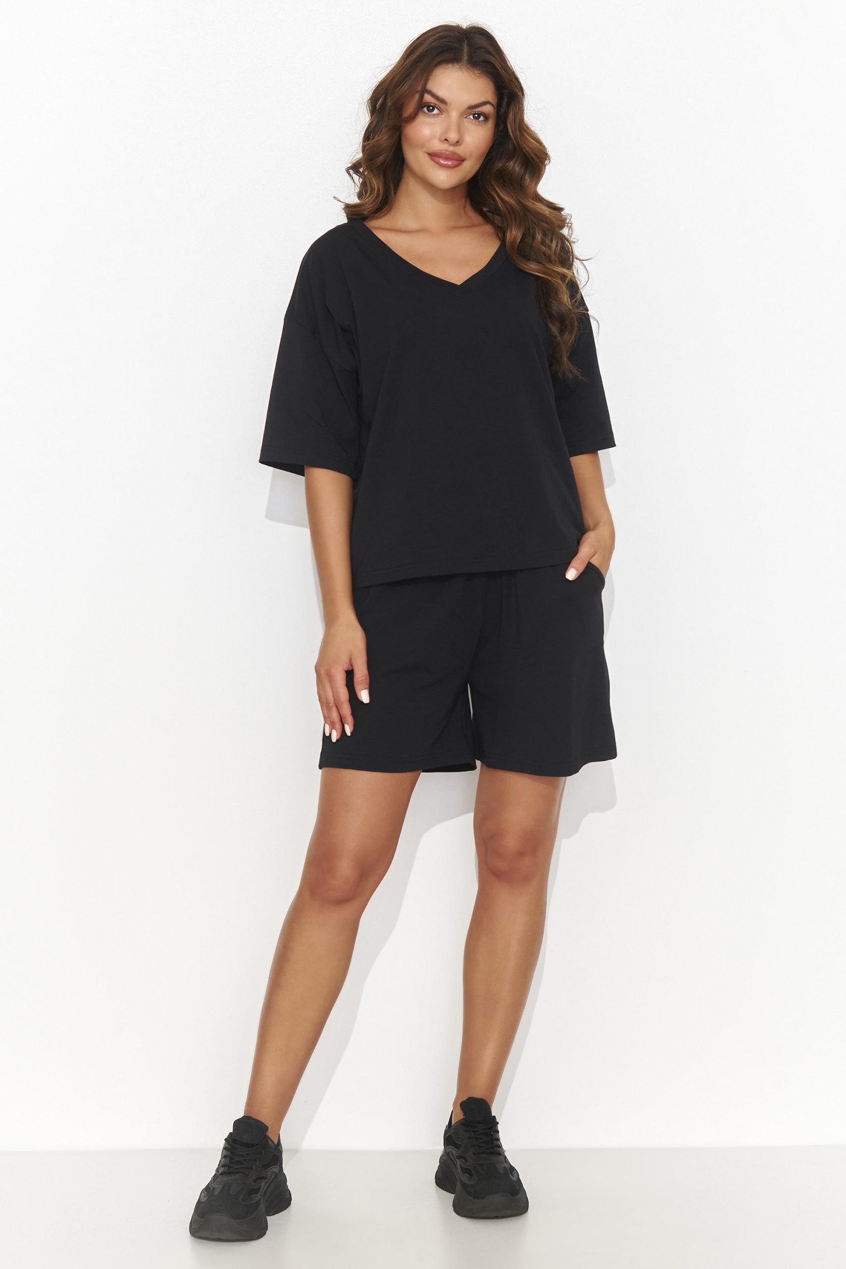Lekki i przewiewny damski komplet uszyty z delikatnej dzianiny odmieni Twoje podejście do wygody. Bluzka z dekoltem w serek, wyposażona w rozkloszowane rękawy ozdobione elegancką blaszką. Swobodny fason bluzki zapewnia wygodę podczas noszenia, a luźne szorty z bocznymi kieszeniami dodają luźnego i sportowego stylu. Ten komplet doskonale sprawdzi się na co dzień, jest idealny zarówno do aktywności sportowej, spotkań ze znajomymi, jak i do pracy. Dostępny w kilku kolorach, oferuje różnorodność, pozwalającą dostosować go do gustu każdej kobiety. Styl, wygoda i nowoczesność, wszystko, czego potrzebujesz w jednym komplecie.