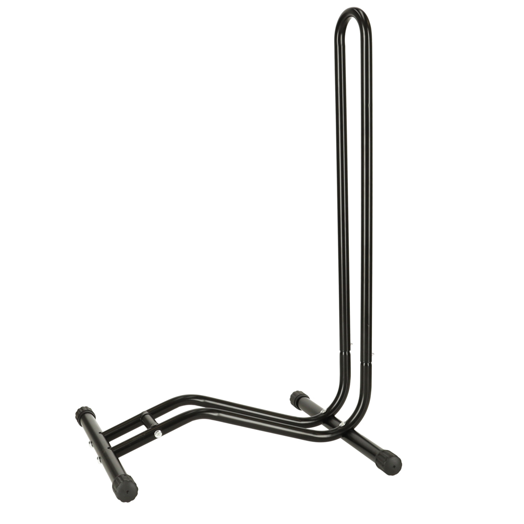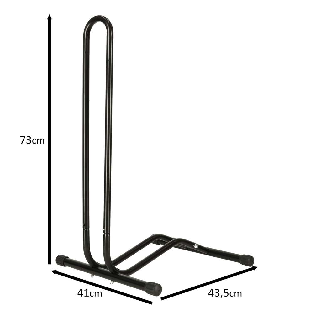Stalowy stojak na rower umożliwiający stabilne postawienie roweru za przednie lub tylne koło. Przeznaczony do rowerów o maksymalnej szerokości opon 65, cm i średnicy 16-27,5″. Wymiary: 41 cm x 43,5 cm x 73 cm.