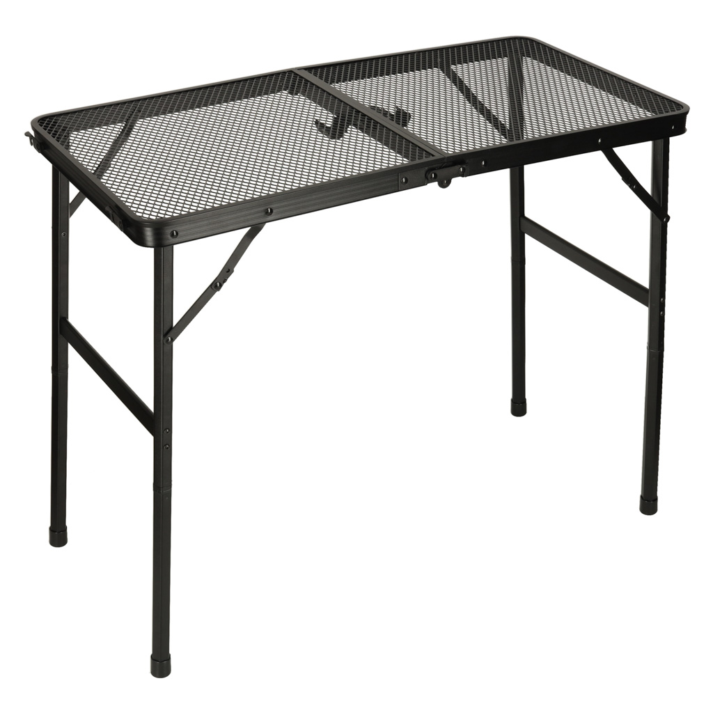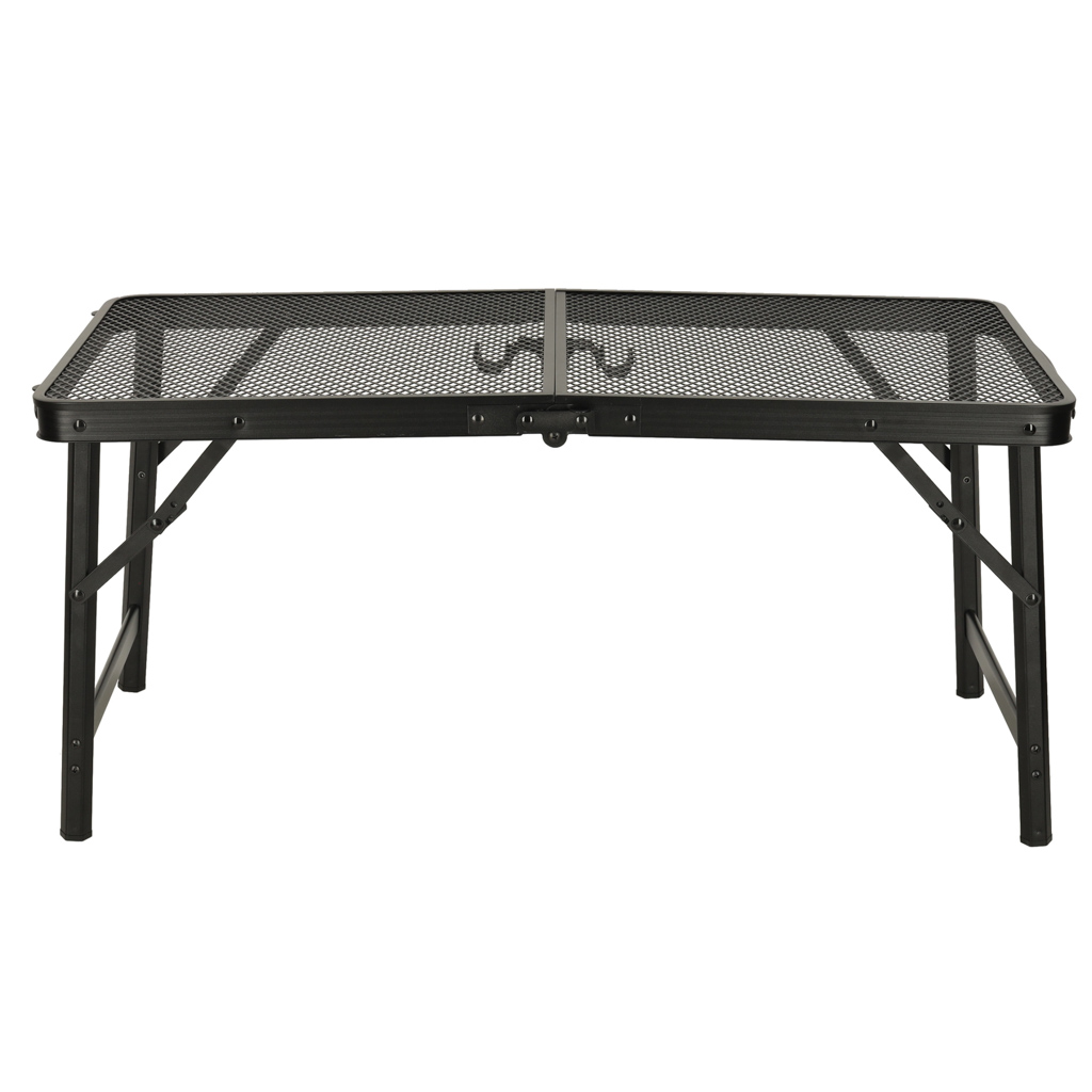 Składany stolik turystyczny z aluminiową konstrukcją i żelaznym blatem siatkowym. Wymiary: 88 × 60 × 40 x 27 cm, waga: 1,6 kg. Idealny na kemping, piknik, balkon, do ogrodu i w podróży. Lekki, kompaktowy i łatwy w transporcie.