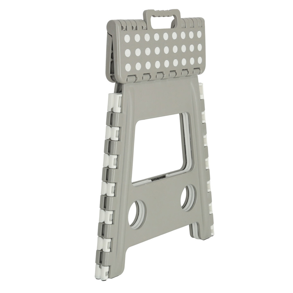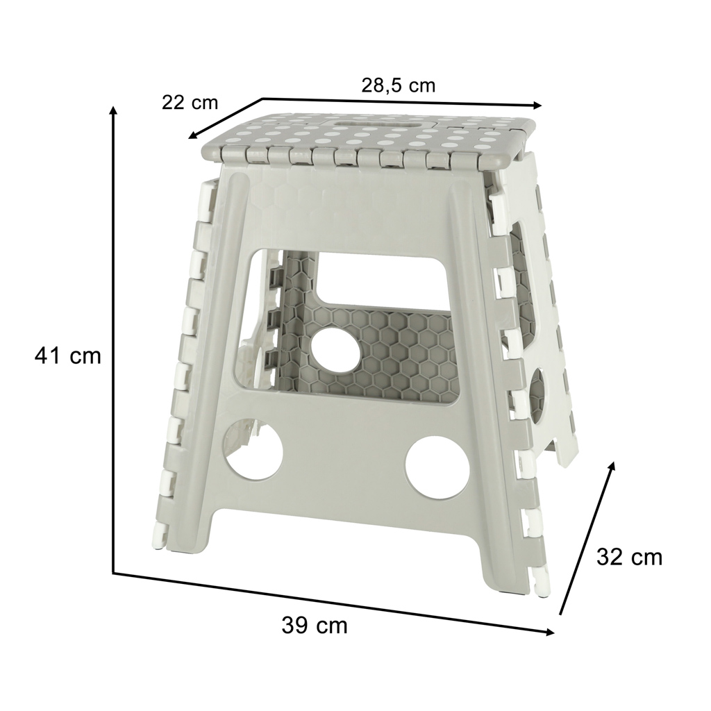 Kolor: jasnoszary. Tworzywo: plastik. Maksymalneobciążenie: do 150 kk. Wymiary porozłożeniu:. Wysokość: 39,5 cm. Szerokość siedziska (góra): 22 x 28,5 cm. Szerokość podstawy (dół): 32 x 39,1 cm. Wymiary pozłożeniu:. Wysokość (bez rączki): 50 cm. Wysokość