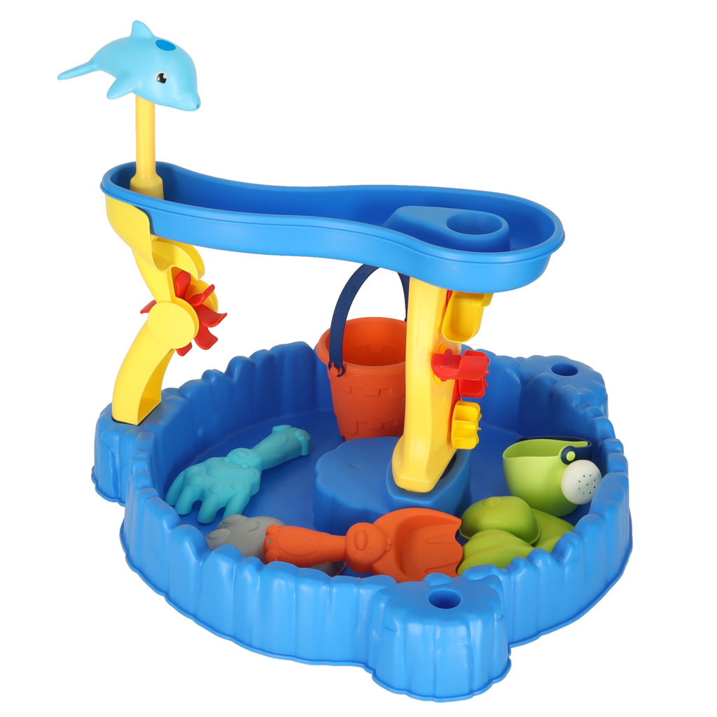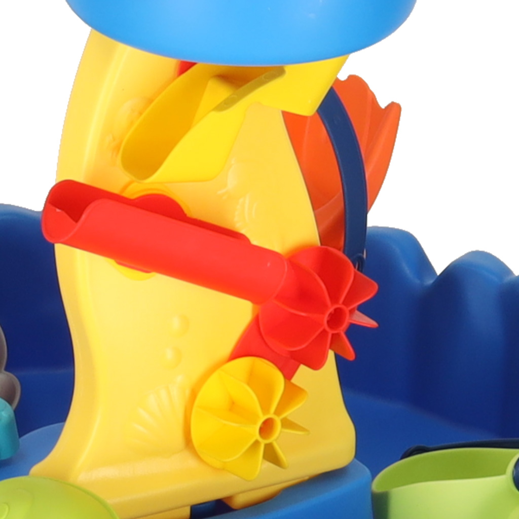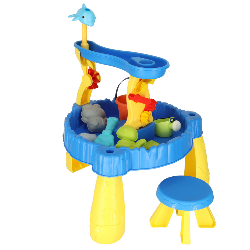 Stolik wodny 2w1 z akcesoriami do zabawy piaskiem i wodą oraz siedziskiem. Ma fontannę oraz tor wodny – idealny do zabawy na dworze lub na plaży. Wymiary: 68 cm x 50 cm, kolor: mix