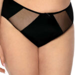 Stringi Angel w kolorze czarnym z o klasycznym kroju. Przód wykonany z niebieskiej koronki. Tył z siateczki. Nogawki obszyte taśmą koronkową. Przód ozdobiony satynową kokardką.