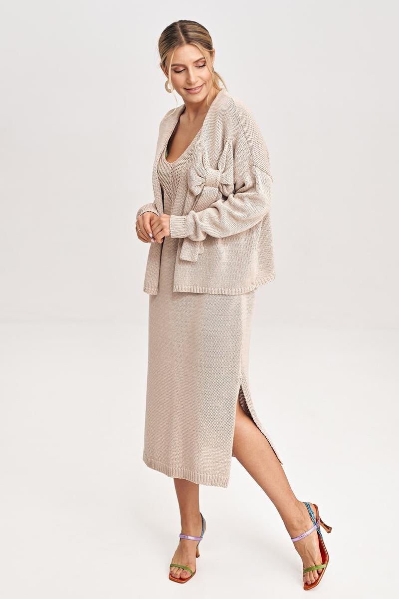 Komplet dwuczęściowy składający się z midi sukienki oraz bolerka. Bolerko z długim rękawem, niezapinane z ozdobną kokardą na przodzie. Sukienka na grubych ramiączkach oraz głębokim dekoltem.