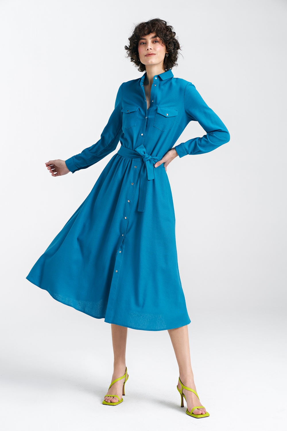 Sukienka o kroju regularnym to doskonała propozycja dla kobiet ceniących komfort i elegancję. Wykonana z wysokiej jakości materiałów, takich jak wiskoza, len i bawełna, gwarantuje przyjemne noszenie i zachowanie świetnego wyglądu na co dzień. Klasyczny kołnierzyk nadaje sukience ponadczasowego charakteru, podkreślając jednocześnie subtelność i klasykę. Długi rękaw z mankietem dodaje sukience elegancji, nadając jej uniwersalny charakter, który świetnie sprawdzi się w różnych okolicznościach. Zapięcie na srebrne napy jest nie tylko praktyczne, ale również stanowi delikatny element ozdobny, nadający sukience wyjątkowego uroku. Długość midi to modny wybór, który podkreśla kobiecą sylwetkę, jednocześnie pozostając odpowiednią zarówno na co dzień, jak i na bardziej formalne okazje. Sukienka posiada ozdobne kieszenie na wysokości piersi, co nadaje jej charakteru i oryginalności. Dodatkowe kieszenie w bocznych szwach sukienki są praktyczne i dodają jej swobodnego charakteru. W komplecie znajduje się stylowy pasek, który pozwala podkreślić talię, nadając sukience jeszcze bardziej korzystny wygląd. Sukienka nie posiada podszewki, co sprawia, że jest lekka i idealna na cieplejsze dni. To doskonała propozycja dla kobiet ceniących wygodę, elegancję i ponadczasowy styl.