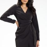 Sukienka mini A470 z długim rękawem zakończonym gumką. Posiada delikatny, kobiecy dekolt w literę V. Poprzeczne przeszycia tworzą falbanki dodające sukience uroku. Prezentowany model to świetna propozycja na spotkania ze znajomymi oraz na bardziej formalne spotkania. Bardzo dobrze prezentuje się zarówno z białymi sneakersami jak i szpilkami.
