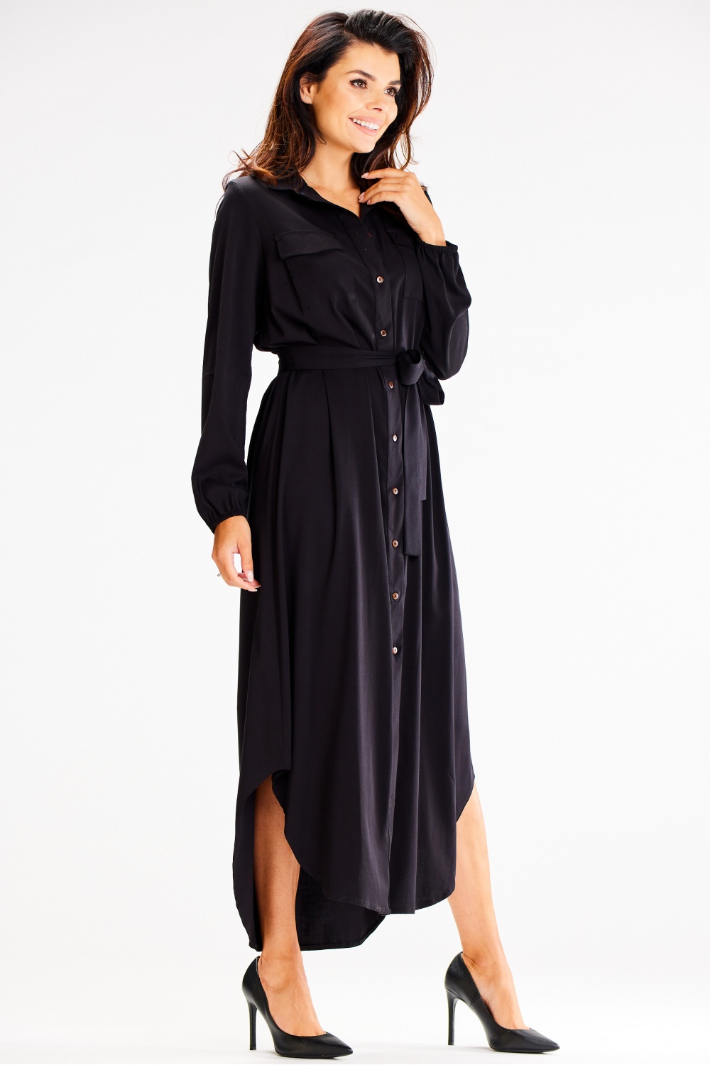 Luźna, koszulowa sukienka maxi z długimi rękawami, zapinana na guziczki. Przód ozdobiony dużymi kieszeniami, w pasie wiązana paskiem.