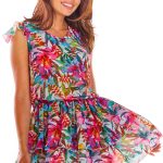 Sukienka z długimi rękawami i z falbanami, dzięki którym dół jest rozkloszowany. Sukienka ma w pasie wszytą gumkę w celu dopasowania do sylwetki, dodatkowo jest przewiązana paskiem. Propozycja idealna na wiele okazji.