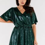Urocza sukienka wykonana z delikatnej i połyskującej siatki, jej elegancję podkreśla satynowa podszewka. Długie, lejące rękawy dodają subtelności, podczas gdy okrągły dekolt nadaje całości ponętny urok.