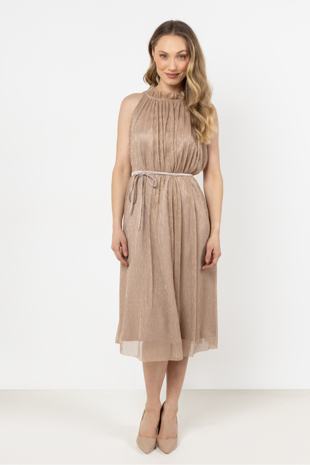 Elegancja i nowoczesność, ta sukienka to idealny wybór na wyjątkowe okazje. Trapezowy krój i odkryte ramiona nadają jej lekkości, a satynowy pasek w talii subtelnie podkreśla sylwetkę. Dekolt halther dodaje szyku, a satynowa podszewka zapewnia komfort noszenia. Doskonale sprawdzi się na eleganckie przyjęcia i wyjątkowe uroczystości.