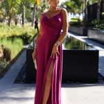 Długa błyszcząca suknia maxi z kopertowym dekoltem i rozcięciem na nodze. Sukienka w kolorze zieleni butelkowej z brokatem. Sukienka pięknie eksponuje dekolt i świetnie układa się w tańcu. Zapinana z tyłu na kryty zamek. Produkt polski. Marka numoco.