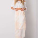 Sukienka o luźnym kroju, z krótkim rękawkiem, dekolt w serek. Sukienka posiada podszewkę, w pasie wiązanie. Sukienka z ażurowymi wstawkami.