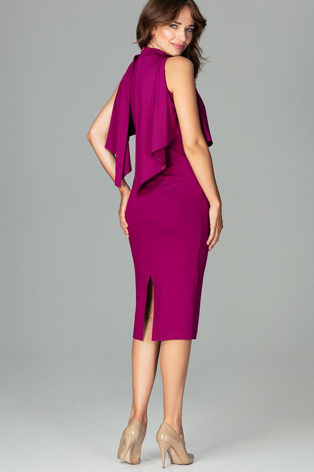Dopasowana sukienka na stójce z doszytą peleryną. Idealna na wielkie wyjścia i romantyczne kolacje. Dodatkowym atutem jest tył peleryny i komfortowe rozcięcie sukienki. Zapinana na kryty zamek na plecach.