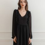 Czarna lekka zwiewna sukienka midi bez rękawów. Kopertowy dekolt, przeszyta w pasie z ozdobnym wiązanym paskiem. Rozkloszowany asymetryczny dół sukienki. Zapinana z lewej strony na kryty zamek.