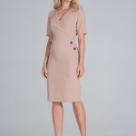 Koszulowa sukienka maxi z kołnierzykiem. Na linii biustu ozdobne patki. Długi rękaw wykończony mankietem zapinanym na guzik. Sukienka zapinana na guziki, wiązana w pasie. Rozcięcia po bokach. Sukienka bez kieszeni oraz podszewki.