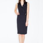 Sukienka midi bez rękawów. Dół sukienki ołówkowy bez kieszeni. Sukienka z paskiem i ozdobną złotą metalową klamrą. Kopertowy dekolt.