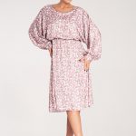 Sukienka zakładana z efektownymi rękawami w groszki. Z przodu i na mankietach ozdobne złote guziki.