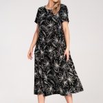 Sukienka maxi z krótkim, bufiastym rękawem i kwadratowym dekoltem. Góra dopasowana, odcinana w pasie, z szerokim, marszczonym dołem. Tkanina gładka, pokryta wyrazistym, kolorowym wzorem w stylu ceramicznych kafli.