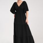 Sukienka maxi bez rękawów, z zaokrąglonym dekoltem oraz prostą górą. W talii cienki pasek z ozdobnym kwiatem z tej samej tkaniny. Dół luźny, lekko rozszerzany, wykonany z gładkiej, miękko układającej się dzianiny.