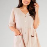Sukienka o luźniejszym kroju, bez rękawów, zapewniająca swobodę ruchów i komfort noszenia. Z przodu klasyczny, okrągły dekolt, natomiast z tyłu efektowny dekolt w kształcie litery V, dodający kobiecego charakteru. Praktyczne kieszenie ukryte w szwach bocznych to funkcjonalny detal. Idealna na co dzień, do pracy lub na letnie spotkania.
