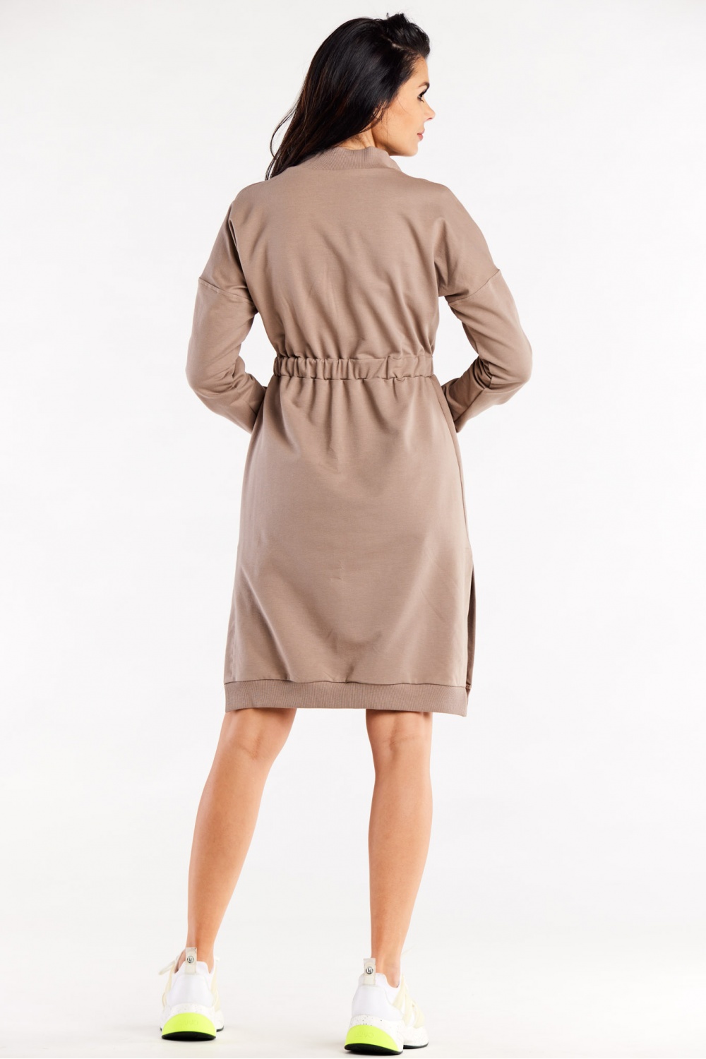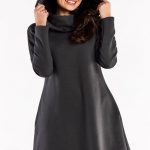 Sukienka z długim rękawem, ozdobnymi rozcięciami na bokach oraz szwami pionowymi na przodzie. W pasie wszyta guma w celu dopasowania do sylwetki. Sukienka jest zapinana na zamek przy dekolcie.