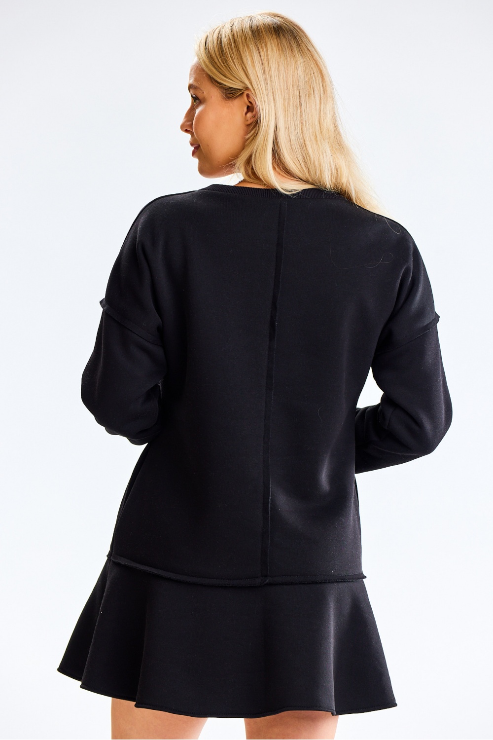 Sukienka z grubej tkaniny dresowej z długim rękawem. U dołu szeroka falbana, w szwach bocznych kieszenie wsuwane. Zaprojektowano i uszyto w Polsce.