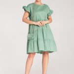 Trapezowa sukienka z dwoma falbanami wiązana pod szyją z rękawem 3/4. Luźna forma sukienki podkreśla uniwersalizm noszenia. Szczególnie dla kobiet chcących ukryć niedoskonałości figury.