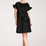 Trapezowa sukienka z dwoma falbanami wiązana pod szyją z rękawem 3/4. Luźna forma sukienki podkreśla uniwersalizm noszenia. Szczególnie dla kobiet chcących ukryć niedoskonałości figury.