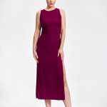Dopasowana sukienka bez rękawów, dekolt z przodu i z tyłu w serek. W pasie falbana z paskiem, z przodu pęknięcie dodaje szyku i elegancji.