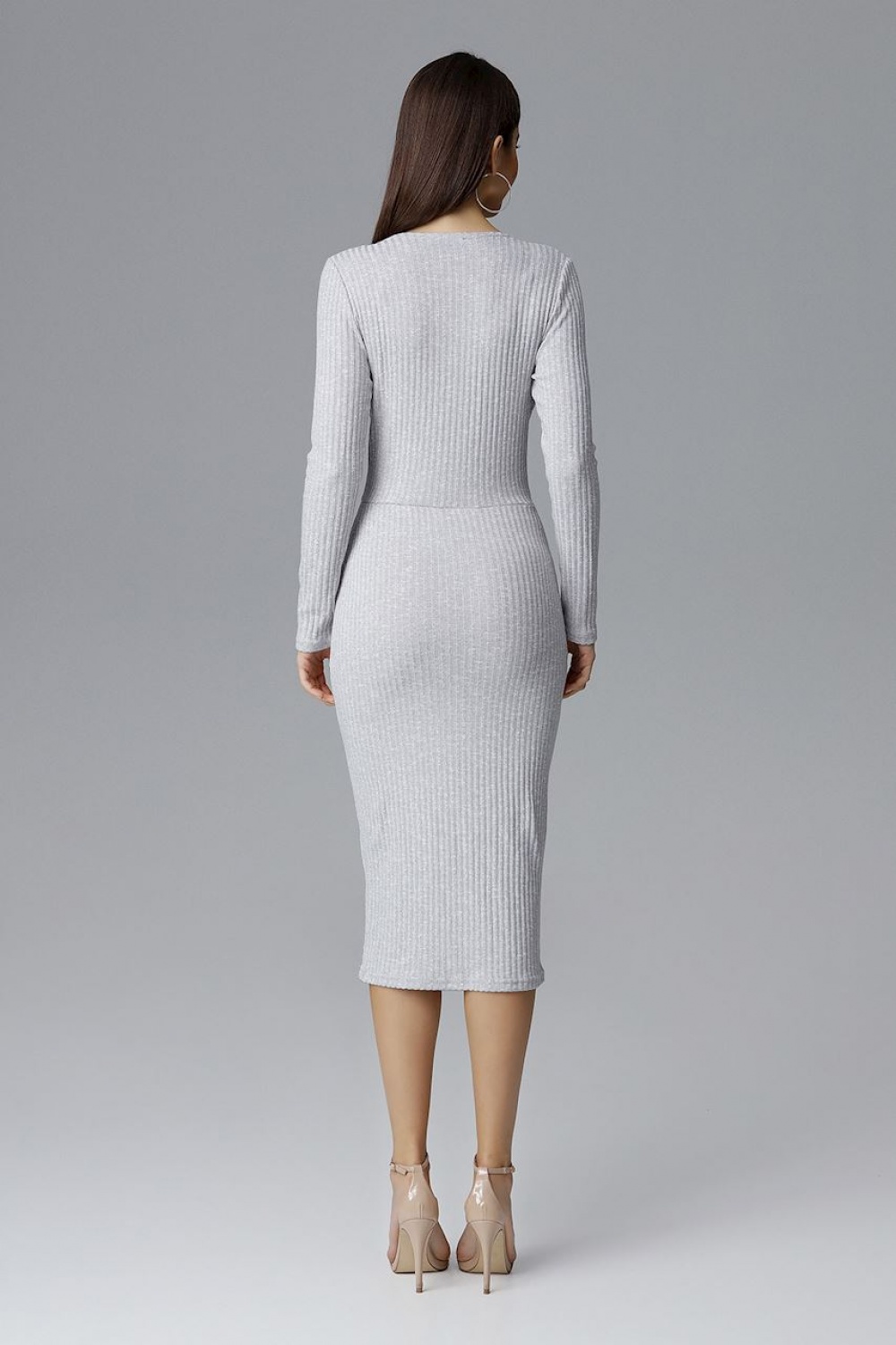 Dopasowana sukienka z długim rękawem z dobrej jakości tkaniny. Model z dekoltem w serek i gumką w pasie.
