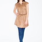 Brązowa sukienka midi z dekoltem w serek, w pasie wszyta gumka. Dodatkowy materiałowy, wiązany pasek. Na lewej nodze asymetryczne rozcięcie, bez podszewki.