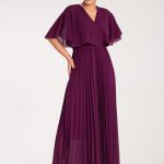 Luźna sukienka do kolan, dekolt w serek, marszczona pod biustem, krótki bufiasty rękaw z gumką. Sukienka wiązana z tyłu paskiem z materiału, bez kieszeni i zapięcia.