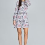 Luźna sukienka do kolan, dekolt w serek, marszczona pod biustem, krótki bufiasty rękaw z gumką. Sukienka wiązana z tyłu paskiem z materiału, bez kieszeni i zapięcia.
