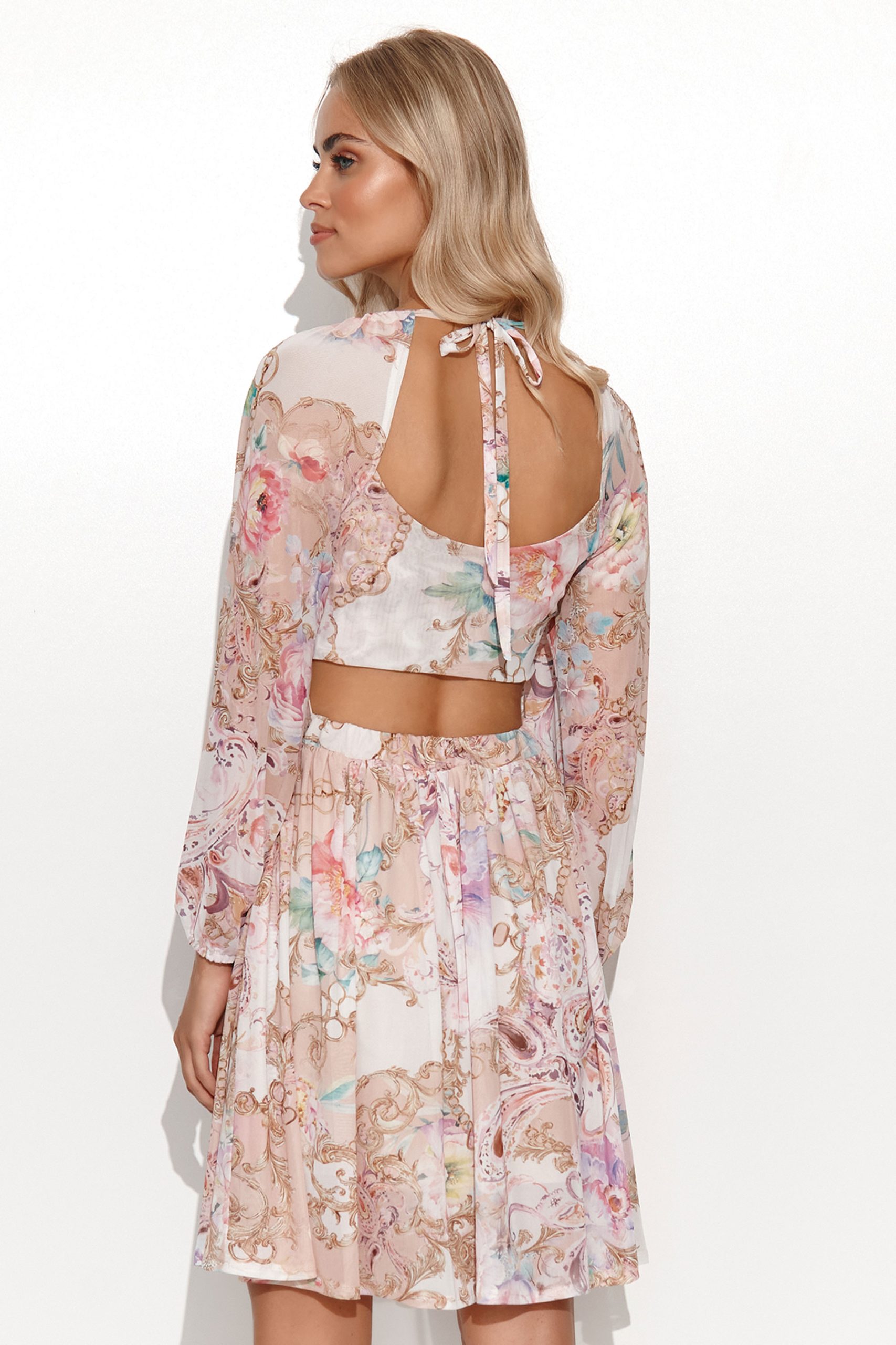 Zwiewna sukienka o niezwykle dziewczęcym fasonie. Posiada długi, lekko bufiasty rękaw. Z przodu widoczny jest dość mocno wycięty dekolt, z materiałem zebranym na biuście. Centralnie wszyty został kawałek materiału, który imituje kokardę. Z tyłu sukienki obecne jest wiązanie wraz ze ściągaczem. Chociaż plecy są widoczne, w sukience zawarty jest dodatkowy pasek materiału, który zakrywa bieliznę. Dzięki temu możesz założyć do tej kreacji biustonosz. Oznacza to, że ten dziewczęcy fason sukienki jest zarezerwowany również dla pań z większym biustem. Gumka ściągająca jest obecna również na linii talii. Spodnia część sukienki jest uszyta z jednolitego materiału. Z kolei wierzchnia to wzorzysta siatka dostępna w trzech wariantach, które różnią się między sobą kolorem i motywem.