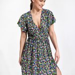 Sukienka midi z żakietowym kołnierzykiem w serek, zapinana do połowy na guziki, rękaw 7/8 z wiązaniem. W pasie wszyta gumka oraz pasek do wiązania, rozkloszowana do dołu.
