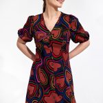 Sukienka midi z żakietowym kołnierzykiem w serek, zapinana do połowy na guziki, rękaw 7/8 z wiązaniem. W pasie wszyta gumka oraz pasek do wiązania, rozkloszowana do dołu.