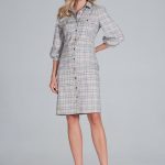 Sukienka maxi odcinana w pasie gumką. Dół rozkloszowany z falbaną, dekolt w serek z klapami, zapinana do połowy na guziki. Rękaw 7/8 wiązany szarfą, zapinana z boku na zamek.
