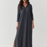 Dopasowana sukienka to stylowa i elegancka kreacja, idealna na chłodniejsze dni. Posiada długi rękaw oraz półgolf, co nadaje jej klasyczny i minimalistyczny wygląd. Fason sukienki jest dopasowany, podkreślający sylwetkę. Charakterystycznym elementem jest marszczenie po obu bokach, które dodaje jej oryginalności i subtelnie modeluje sylwetkę. Model ma na boku rozcięcie, które dodaje sukience kobiecego charakteru i sprawia, że jest wygodniejsza w noszeniu. Długość sięga do kostek, co czyni ją idealnym wyborem zarówno na formalne okazje, jak i bardziej casualowe wyjścia. Sukienka ma stylowe przeszycie z przodu i z tyłu. Stylizacja została dopełniona masywnymi, czarnymi butami na grubej podeszwie, co nadaje całości lekko rockowego charakteru.